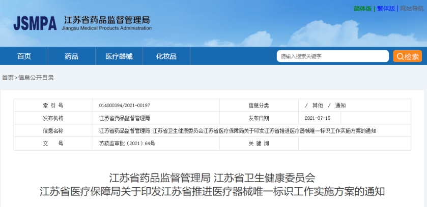 2021年1月1日,第一批UDI正式實施,各省級藥監(jiān)局先后出臺相關政策,推進省內(nèi)第一批UDI工作落地。按照國家藥監(jiān)局要求,未按要求填報產(chǎn)品標識(DI)的,注冊申報資料將不予簽收。這意味著產(chǎn)品標識碼與醫(yī)療器械注冊掛鉤,未來不使用唯一標識的產(chǎn)品將無法注冊上市 在《意見稿》出臺后不久,江蘇省便在《意見稿》的基礎上制定了實施方案,成為最快響應第二批唯一標識實施工作的地區(qū)之一。